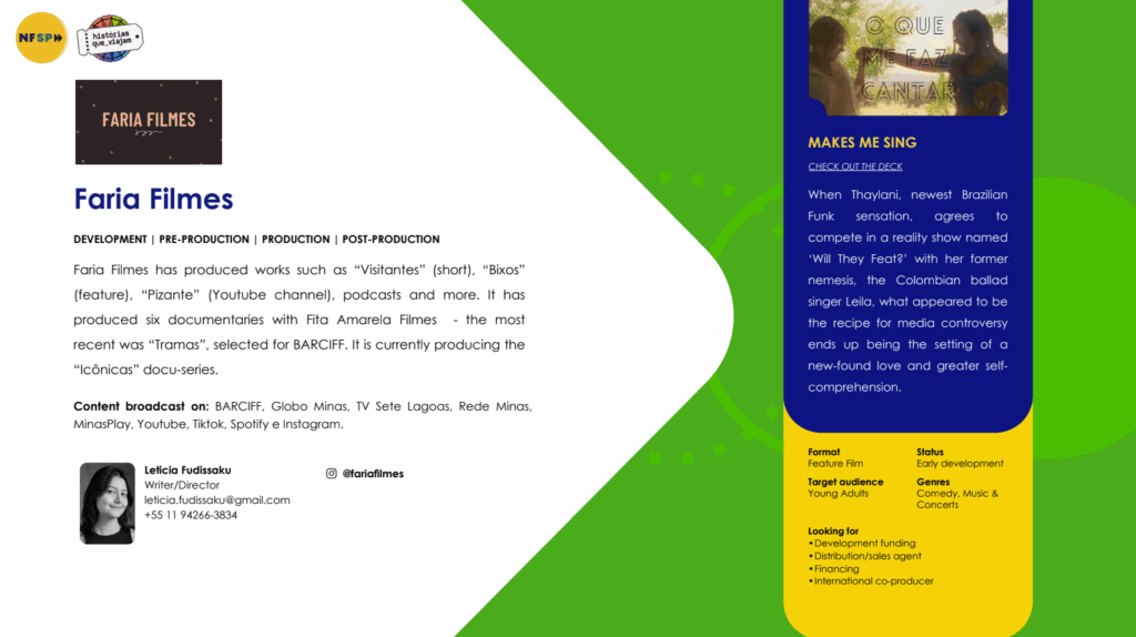 El programa Histórias Que Viajam (HQV) lleva todos los años una delegación de 5 proyectos brasileños que pasan por el laboratorio a lo largo del segundo semestre de cada año. Desarrollado con el enfoque de promover el cine brasileño en este importante mercado, Histórias Que Viajam es patrocinado por Spcine desde su primera edición en 2022.